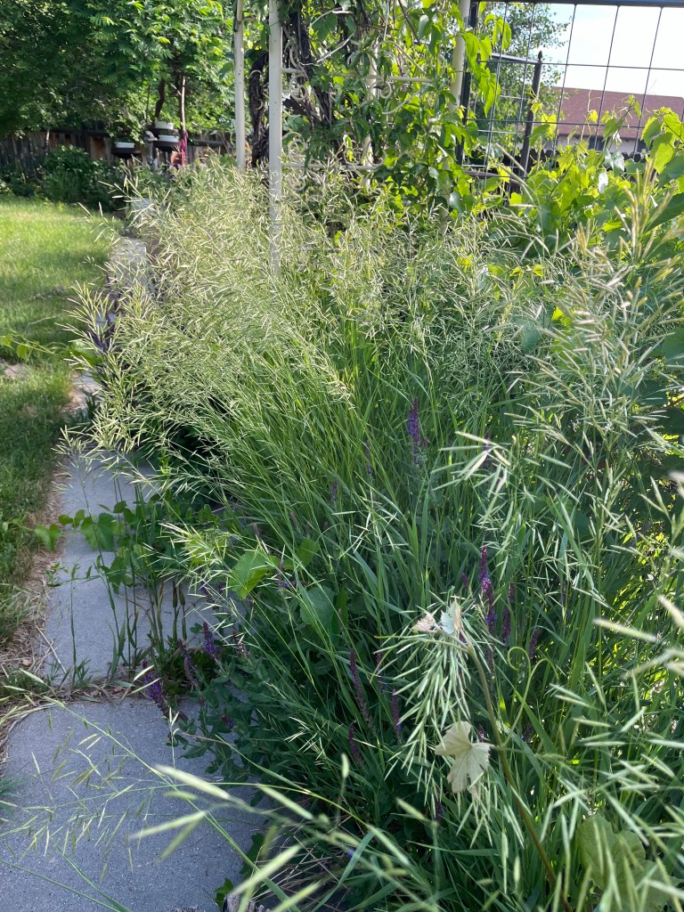 I didn’t consider the invasive grass that somehow niggles and wiggles its way into every possible nook and cranny. This grass can grow waist high and blooms into hanging seeds that can resemble fireworks exploding in the sky. Perhaps the grasses are trying to upstage the perennials. If so, they are succeeding.