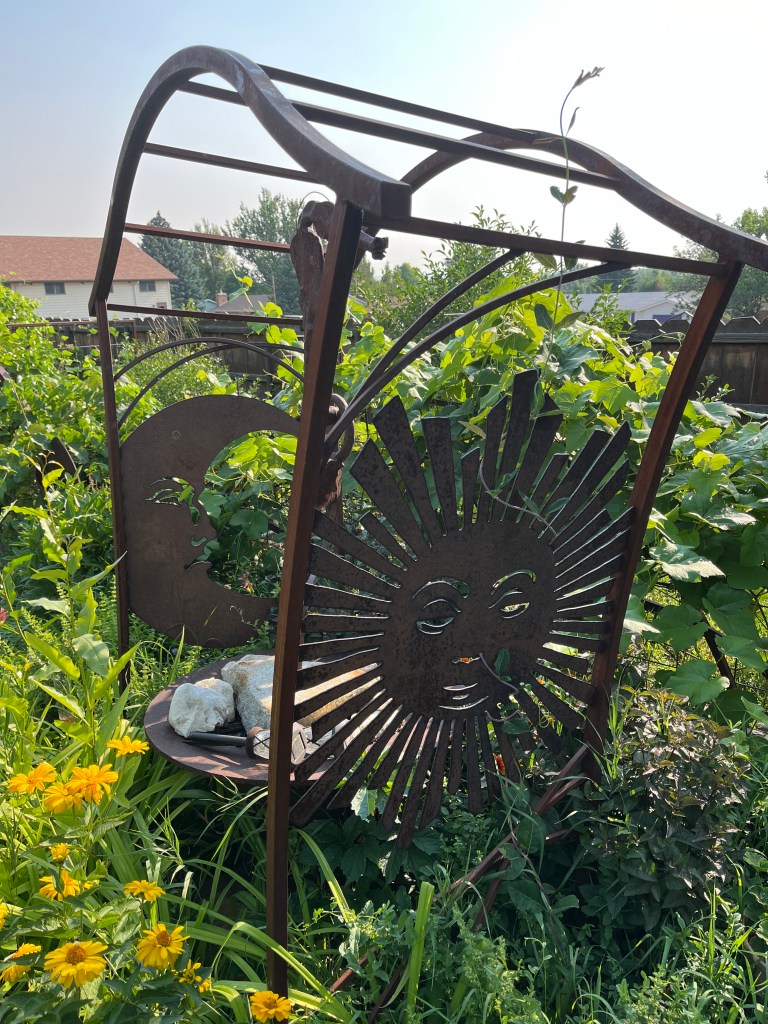 In the area of our sun-moon arbor I dug into pulling grass which yielded the happy news that my honeysuckle was alive and wanting some room. My newest daylily hadn’t died of winter kill after all, and as I reached deep into my mature daylily bank to grab out the grass, I discovered a missing shovel! Whoa – I would have never actually looked there. It must have blown down in the wind last fall. Who knew? I balanced on a few stepping stones to clear the grass from my dark heliopolis and several varieties of coneflowers. I even cleared enough ground to make room to plant sunflowers! The Candice grape that seemed very slow and perhaps dead had little leaf buds near the base! Hope abounds!