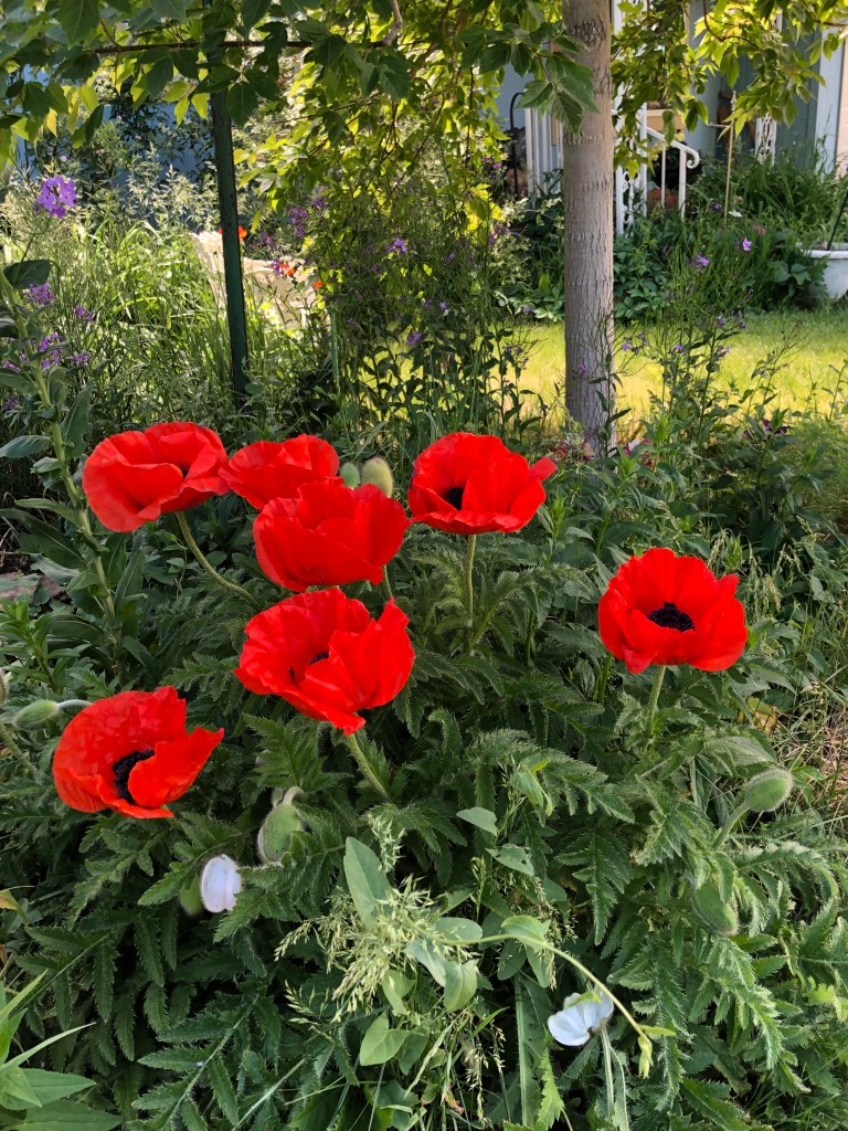 In mid-June I’d finally gotten to a point of diving in. I had to if I wanted to find anywhere to plant annuals (petunias, cosmos, Gerber daisies, geraniums). The ants did their job well and peonies were opened, so those were my next priority with the poppies. Some of the grass surrounding them was taller than the bush itself. Once a person gets started, momentum takes over. It’s hard stopping, even if I didn’t have gloves in my pocket. Some raspberries have taken up residence near the peonies so I left them. They have a mind of their own and don’t seem to like growing where I want them. Their thorny canes snag my clothes and skin. Even some that appeared dead were showing signs of life so they made the cut (pun intended) with hopes of a few juicy berries mid-summer.