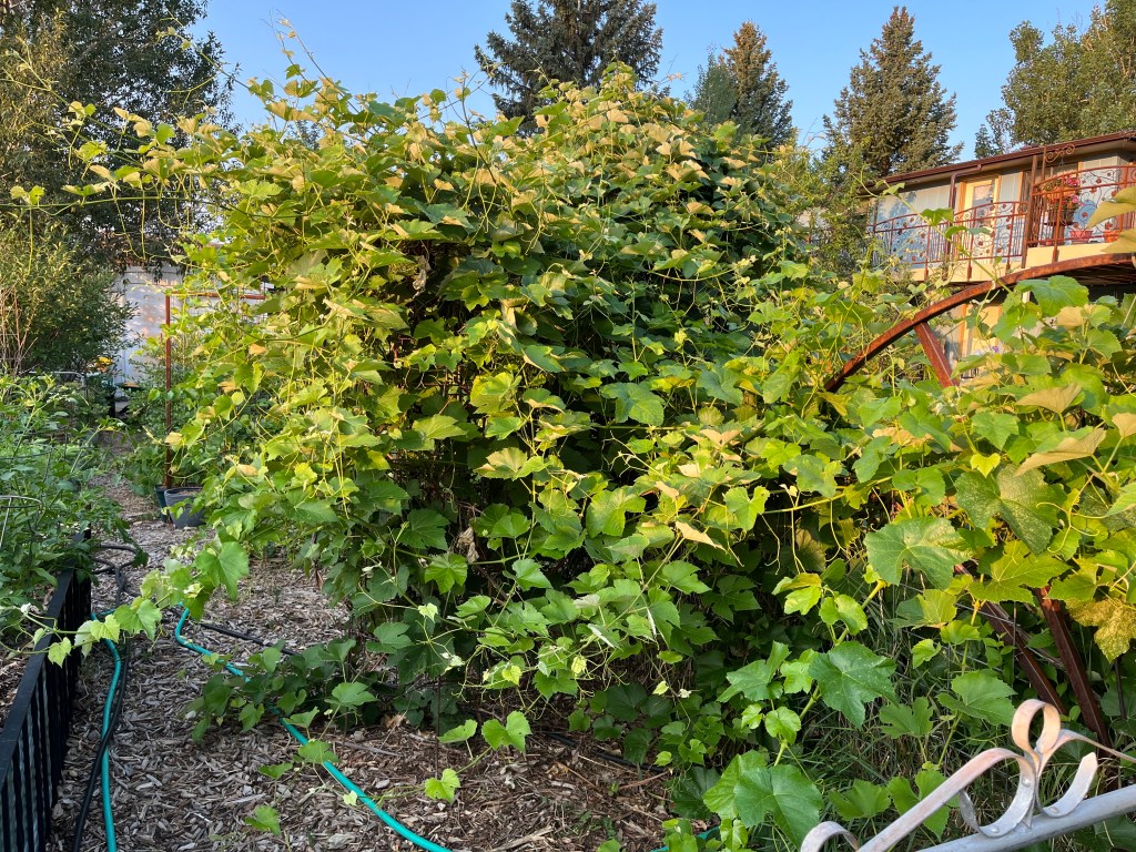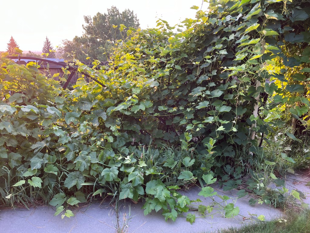 Now, we’ve been here 40 years and I’m amazed at what emerged from the rocks, bentonite, and sagebrush hillside. I’m beyond the once yearly spring grape trimming and just finished my third go-round this summer. I got tired of waiting too long and breaking tree branches while trying to pull the latched on vines from them. Plus they are happy to cover up whatever I’ve unearthed from the grass pulling I spoke of recently (https://bowercorner.com/2024/07/29/the-art-of-pulling-grass/). They also think highly of snuggling up with the sprawling squash, raspberries and anything else in their way.